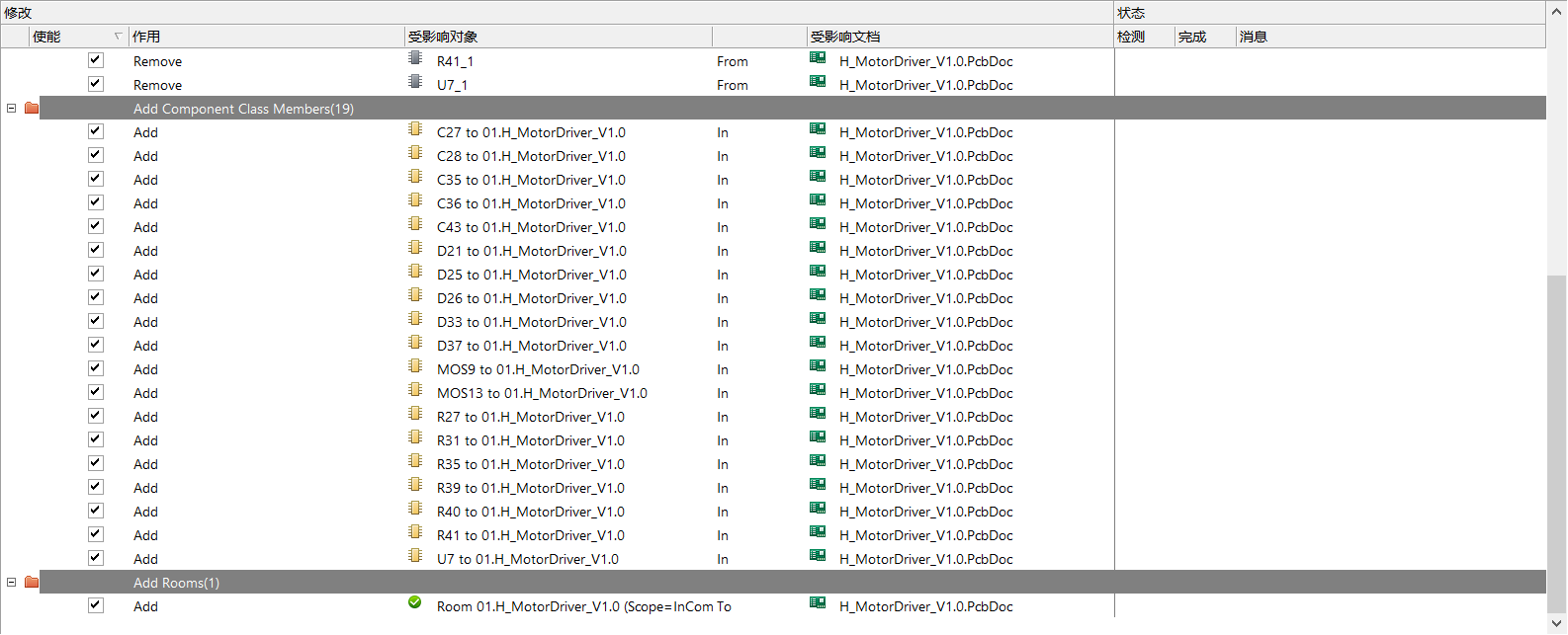 - 解决没有网络连接的问题:明确一点,我的原理图中是完整的很多个单元的驱动电路,接下来通过PCB更新操作,来更新网表,这和PADS的ECO对比功能是一样的,不过AD16的ECO对比很方便。