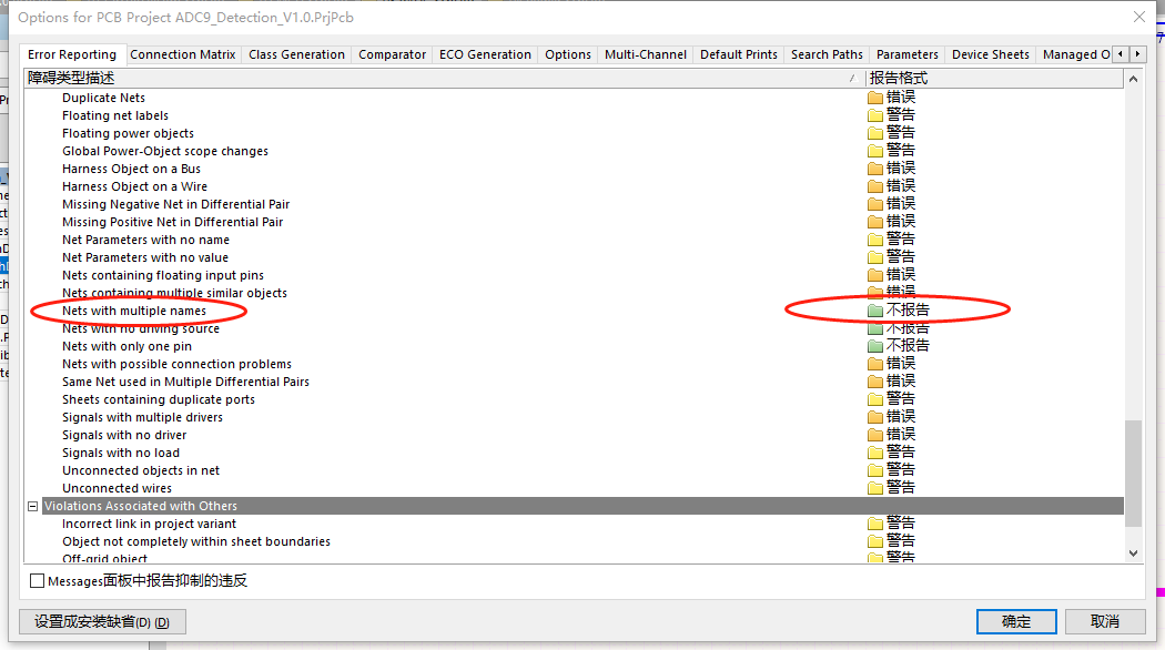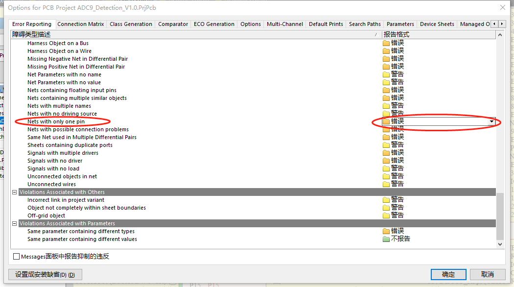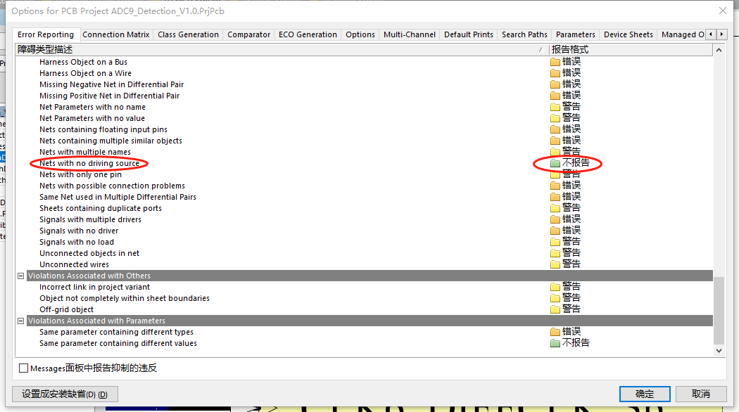 鼠标右键工程文件>工程参数>下图圈中的选项将“错误”更改为“不报告”