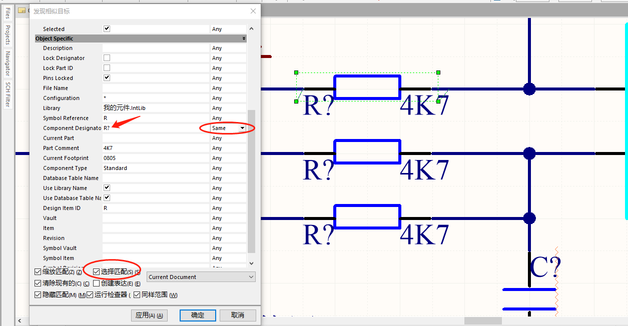 - 任选一个电阻,右键选择“查找相似对象”,我绘制的原理图电阻都还没有统一命名,所以这些电阻的相似点就是元件标识都是“R?”,所以我将“R?”这一栏选成“same”,目的是找到元件标识是“R?”的所有对象。同样的,如果想找同一封装的对象,就把“Current Footprint”这一栏选成“same”。这个功能就是筛选,希望大家可以举一反三。