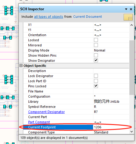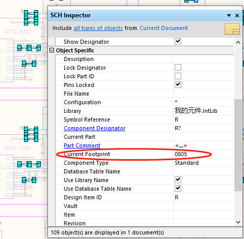 - 点击“确定”,弹出的SCH Inspector窗口找到“Current Footprint”这一栏,更换封装型号。