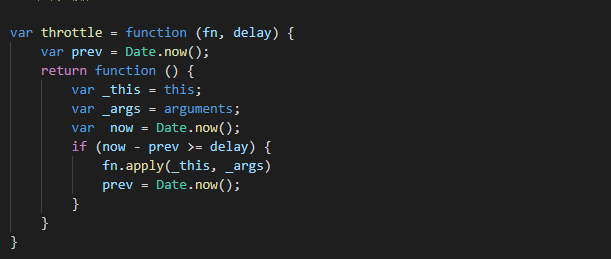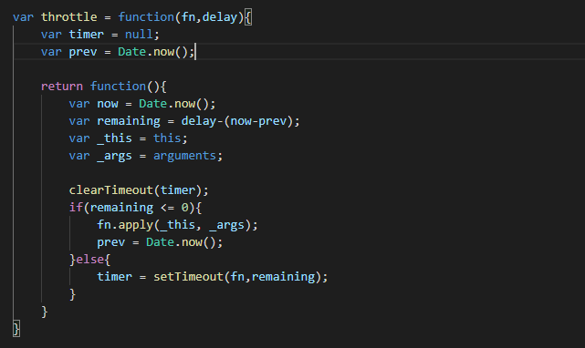 当高频事件触发时,第一次应该会立即执行(给事件绑定函数与真正触发事件的间隔如果大于delay的话),而后再怎么频繁触发事件,也都是会每delay秒才执行一次。而当最后一次事件触发完毕后,事件也不会再被执行了。