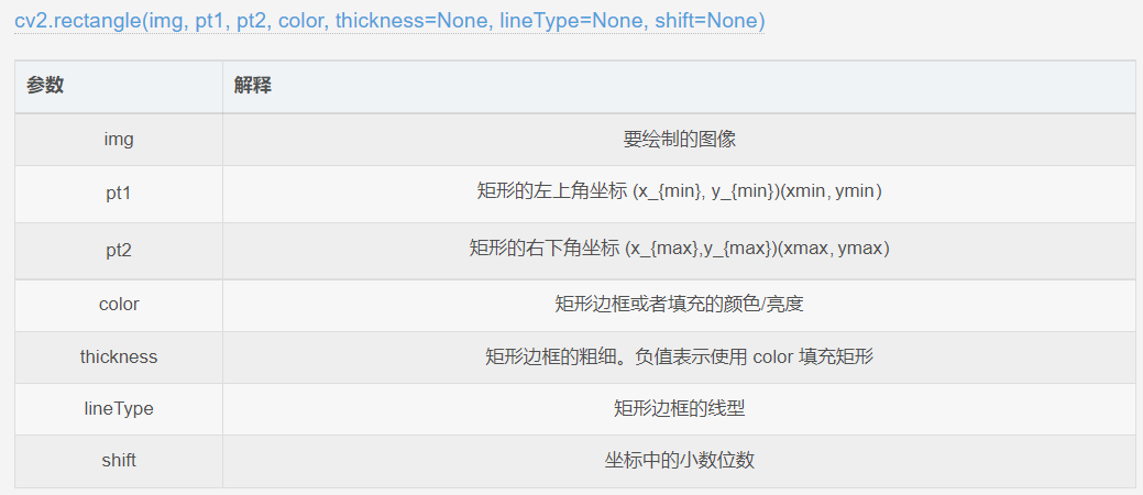 cv2.rectangle(img, pt1, pt2, color[, thickness[, lineType[, shift]]]) 在图上绘制矩形 https://www.freesion.com/article/1539967937/