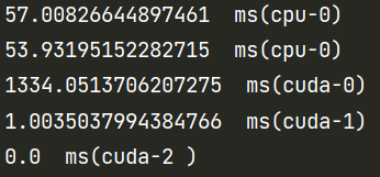 import torch a = torch.randn(10000, 10000).to('cpu') b = torch.randn(10000, 10000).to('cpu') start = time.time() c = torch.add(a, b) end = time.time() print((end-start)*1000 , ' ms(cpu-0)') start = time.time() d = torch.add(a, b) end = time.time() print((end-start)*1000 , ' ms(cpu-0)') a = a.to('cuda')# 初次调用gpu,由于数据传输,速度会较慢 b = b.to('cuda') start = time.time() e = torch.add(a, b) end = time.time() print((end-start)*1000 , ' ms(cuda-0)') a = a.to('cuda') # 超快的速度fasttttttttttttttt!!!!!! b = b.to('cuda') start = time.time() f = torch.add(a, b) end = time.time() print((end-start)*1000 , ' ms(cuda-1)') i = torch.randn(10000, 10000).to('cuda') j = torch.randn(10000, 10000).to('cuda') start = time.time() k = torch.add(i, j) end = time.time() print((end-start)*1000 , ' ms(cuda-2 )')