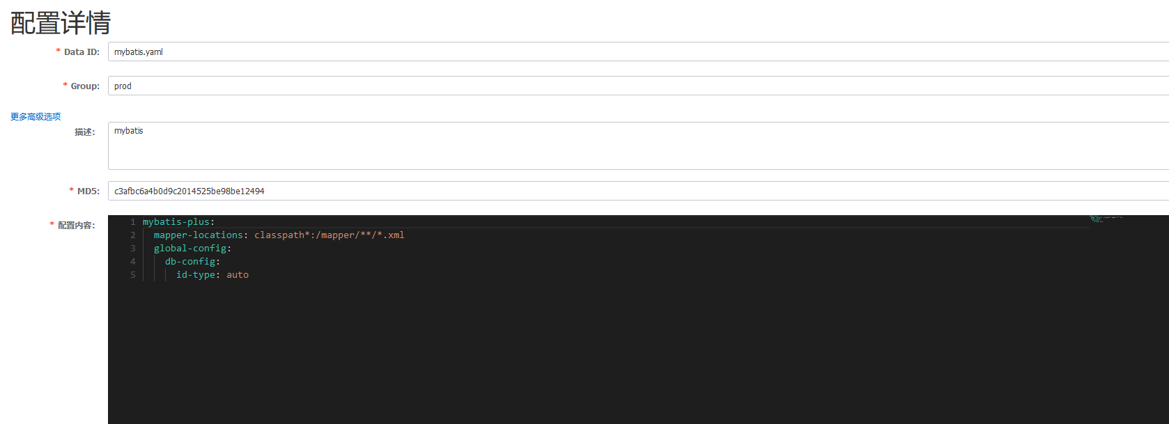 spring: application: name: mall-order cloud: nacos: discovery: server-addr: 192.168.1.137:8848 config: server-addr: 192.168.1.137:8848 #Nacos作为配置中心地址 file-extension: yaml #指定yaml格式的配置 namespace: 598bbad0-2586-43f2-8c00-f4a64e234fe6 group: prod #指定对应的配置组 extension-configs[0]: data-id: mybatis.yaml group: prod refresh: false extension-configs[1]: data-id: datasource.yaml group: prod refresh: false server: port: 100