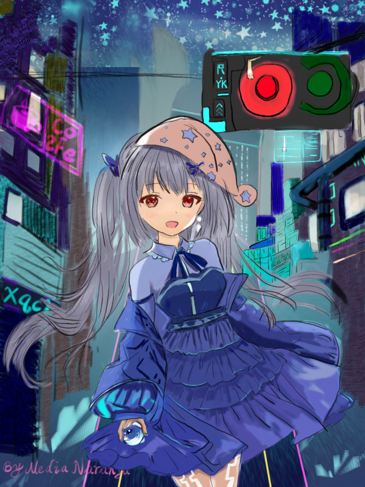 看见青色星辰陨落,氖彩虹想起熬夜做题的往事,于是走进店铺,买了张 Flume 的专辑边听边拿起一本紫书翻阅起来。