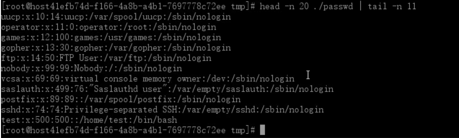 想一想,如果我要选取/tmp/passwd 文件的第10到20行的内容该怎么办呢?我们可以这样做,先选取头20行,然后再取后11行不就行了。那怎么做呢。这里我们就要用到管道命令了。先用 head 选取前20行,然后把输出结果交给tail命令选取后11行内容就行了。