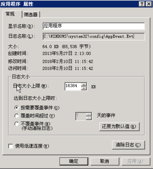 在事件查看器中右键应用程序(或安全性、系统、DNS服务器)查看属性可以得到日志存放文件的路径,并可修改日志文件的大小,清除日志。例如选中“应用程序”右键属性,如下图: