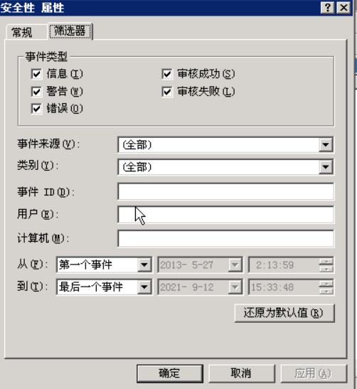 选中事件查看器中左边的树形结构图中的日志类型(应用程序、安全性或系统),右击“查看”,并选择“筛选”。或者点击属性页面的筛选器标签,日志筛选器将会启动。通过筛选器系统会过滤出管理员希望查看的日志记录
