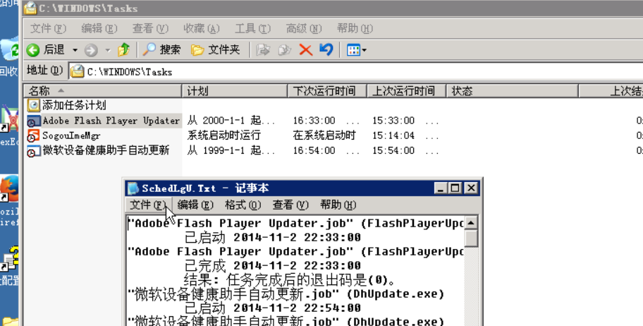 当入侵者得到远程系统的shell之后,常会利用计划任务运行功能更加强大的木马程序,计划任务日志详细的记录的计划任务的执行时间,程序名称等详细信息。