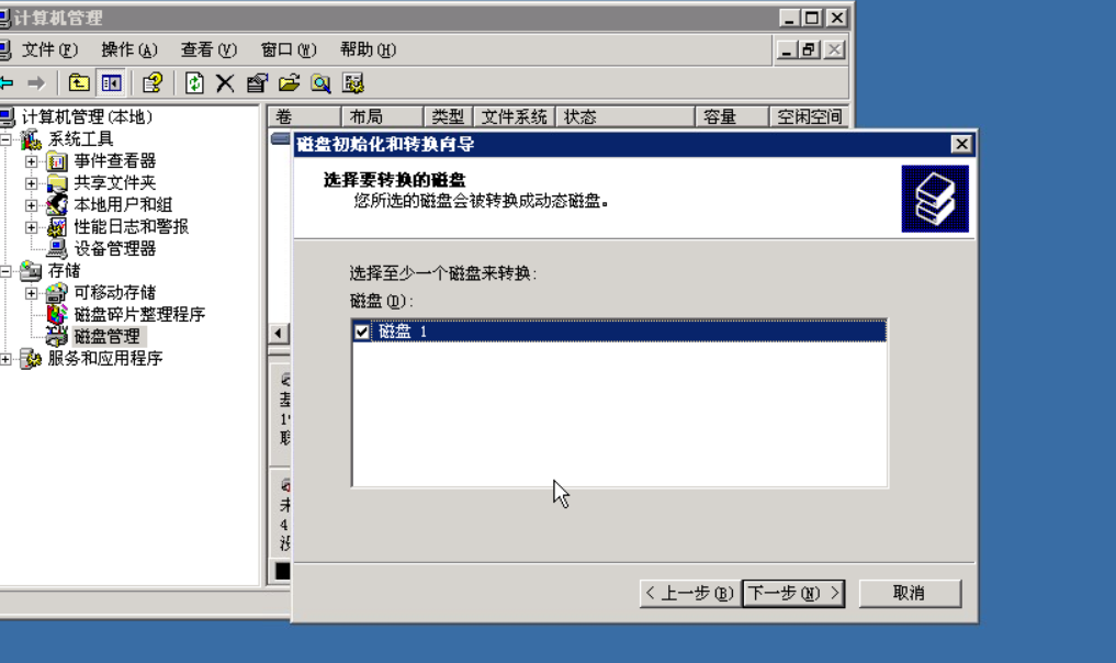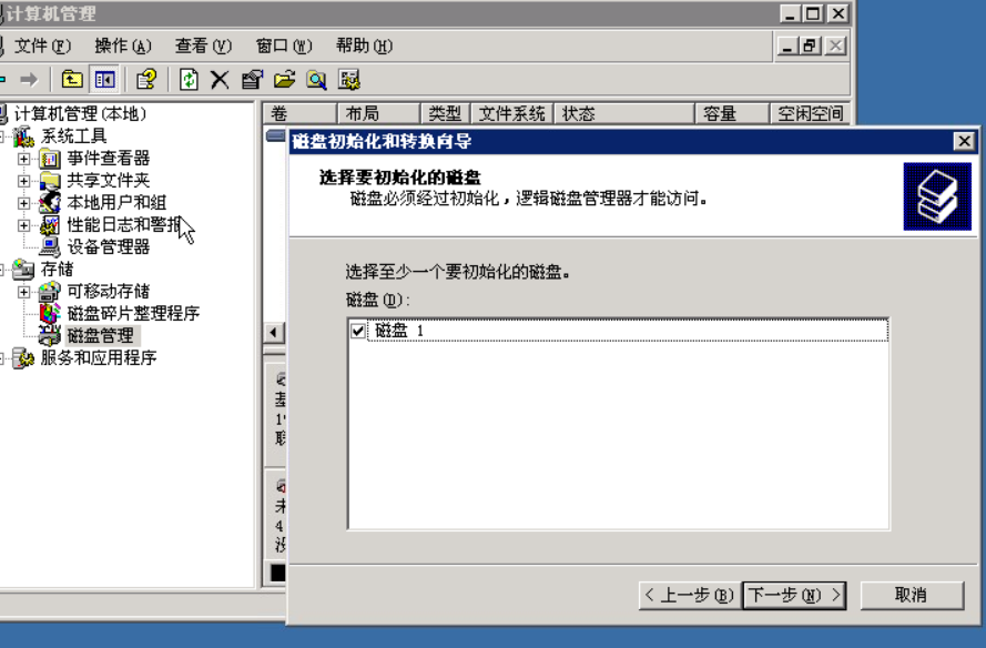 点击磁盘管理,会出现磁盘初始化和转换向导,利用向导添加一块新的磁盘,如下图: