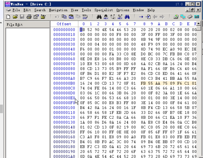 找到第一扇区末尾:000001F0处,查看末尾标志是否为55AA。