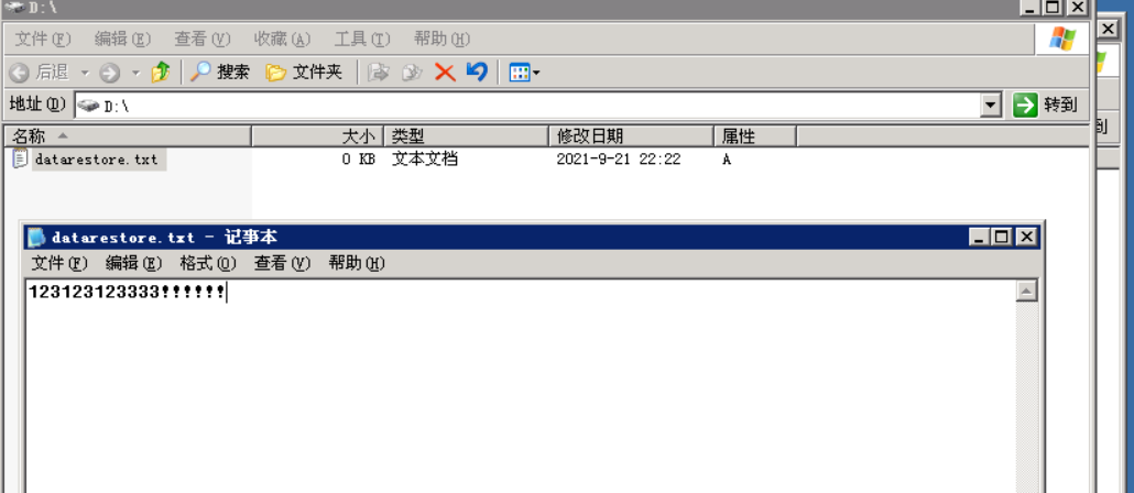 关闭winhex,打开D盘(新建立的分区),建立一个文本文件,命名为:datarestore.txt,并添加内容。