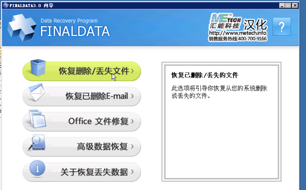 打开该程序,显示主界面如下图,选择“恢复删除/丢失文件”: