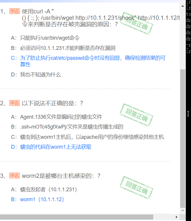 1.使用ssh登录蠕虫发起者主机(10.1.1.231),执行下面三条命令。命令执行结果如下图所示。