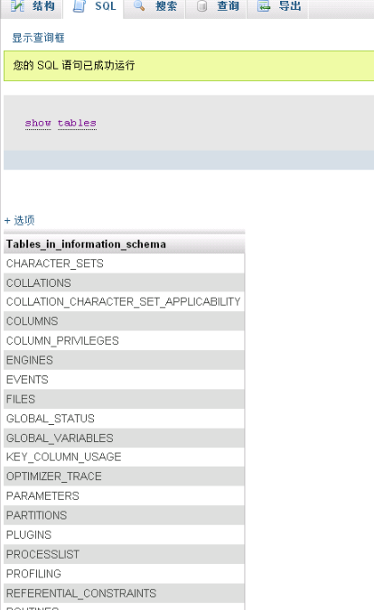 information_schema数据库是MySQL自带的,MySQL 5以下没有这个数据库,它提供了访问数据库元数据的方式。什么是元数据呢?元数据是关于数据的数据,如数据库名或表名,列的数据类型,或访问权限等。也就是说information_schema中保存着关于MySQL服务器所维护的所有其他数据库的信息。如数据库名,数据库的表,表栏的数据类型与访问权限等。在INFORMATION_SCHEMA中,有数个只读表。