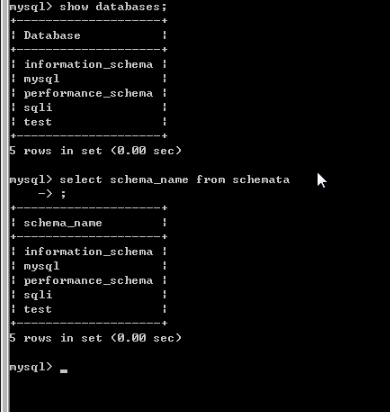 可以看到他们的作用是一样的,都是列出所有数据库,跟我们前面说的一样,SCHEMA_NAME字段保存了所有的数据库名。