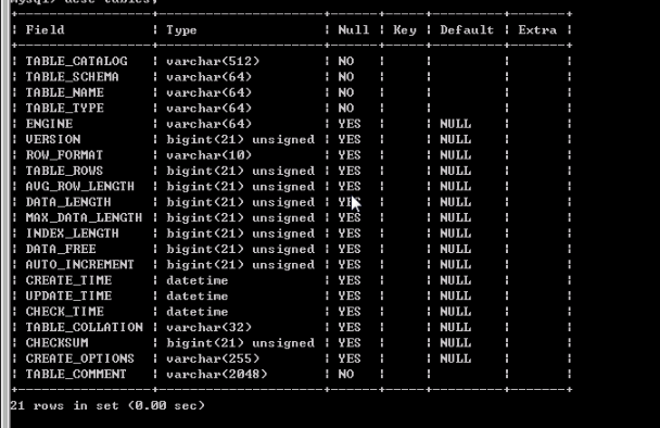 desc 可以用来看表结构。看下tables的表结构,执行desc tables;,结果如下图: