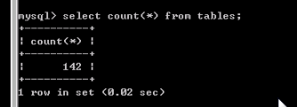 注意上图中标记的那2条记录,每一条记录中,他们分别记录一个表名和一个这个表所属的库名。其中TABLE_NAME保存的是表名,而TABLE_SCHEMA保存的是这个表名所在的数据库。我们可以查询一条记录看看,在查询前,先看看有多少条记录,避免记录太多查看不方便,执行select count(*) from tables; 结果如下图: