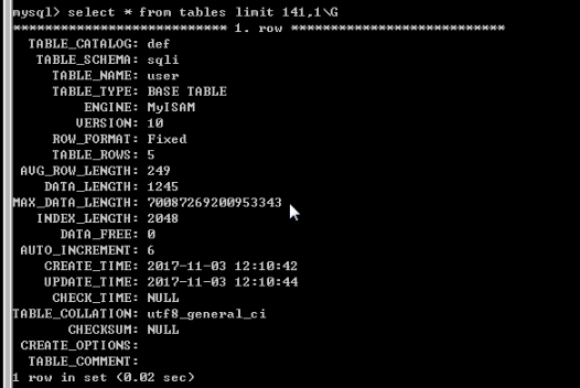 说明当前所有数据库中的表数量为142。查询任意一条记录查看,我这里选择最后一条记录,SQL语句为:select * from tables limit 141,1\G由于在客户端中,默认查询结果显示不友好,所以,可以把语句后面的分号改成\G,他会让一条记录显示一行,看起来不那么乱。\G只支持在客户端中用,在其他连接数据库的软件中,使用\G会报错。