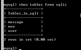 可以看到,最后一条记录的TABLE_NAME是user,TABLE_SCHEMA为sqli。查看sqli数据库中的表,SQL语句为:show tables from sqli;可以看到确实存在user表。