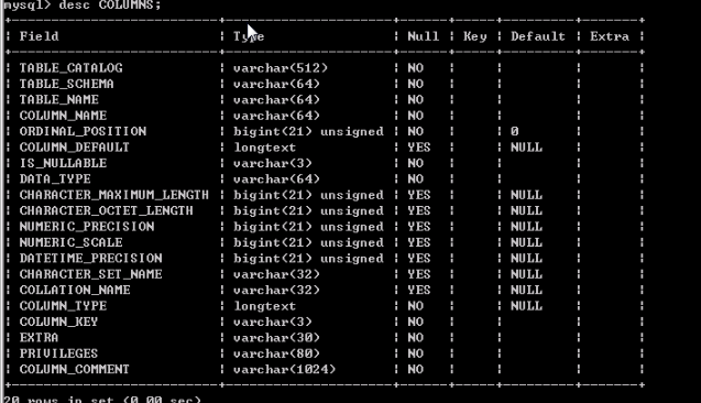 幸运的是,在information_schema数据库中,同样存在一个表,它保存了整个数据中,所有的列名,这个表就是COLUMNS。同样先查看该表结构。