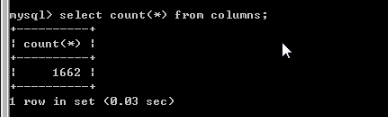 这里面,与注入相关的存在3个字段,分别是TABLE_SCHEMA、TABLE_NAME以及COLUMN_NAME,不难猜到,如果在该表中查询一条记录,TABLE_SCHEMA保存了这条记录保存的字段所属的数据库名,而TABLE_NAME保存的是该字段所属表名,COLUMN_NAME则是一个列名记录,查询一条记录验证一下,首先确定该表有多少条记录,执行select count(*) from columns;,得知一共有1662条记录,结果如下图: