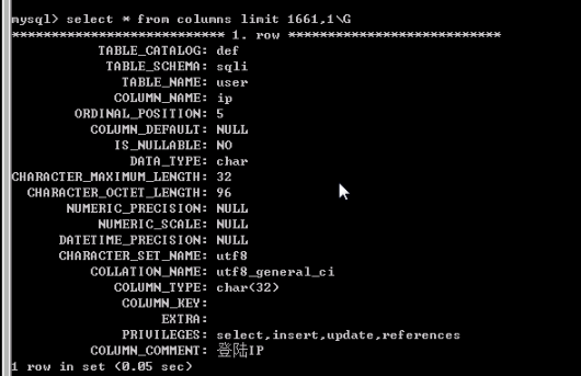 我们获取最后一条记录,执行select * from columns limit 1661,1\G