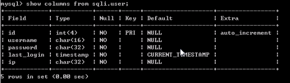 查看sqli的user表是否存在该字段,执行SQL语句:show columns from sqli.user;
