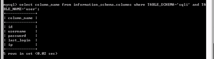 select column_name from information_schema.columns where TABLE_SCHEMA='sqli' and TABLE_NAME='user';