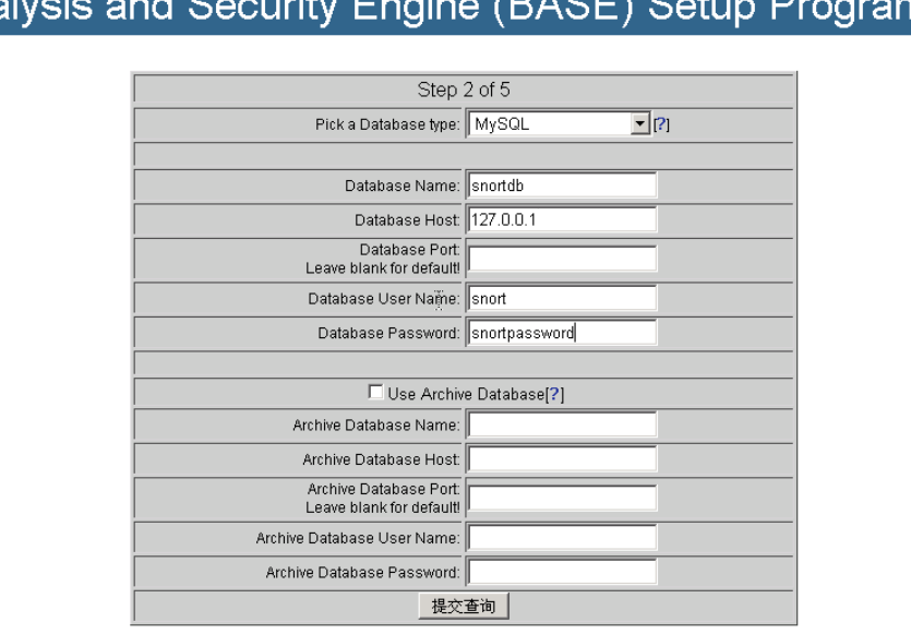 输入数据库信息,Pick a Database type:MySQL,Database Name:snortdb,Database Host:127.0.0.1,Database User Name:snort,Database Password:snortpassword