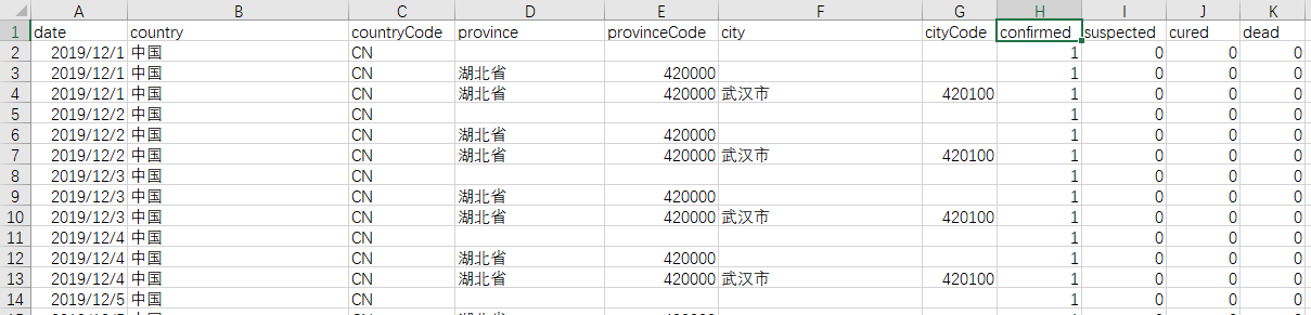 数据的列名分别为:date:日期,country:国家,countryCode:国家简写,province:省级地区,provinceCode:省级地区邮政编码,city:城市,cityCode:城市邮政编码,confirmed:确诊病例,suspected:疑似病例,cured:治愈病例,dead:死亡病例。从纵向来看:数据以时间为轴,记录了全世界疫情情况,总共229061条数据。数据从可追溯的2019.12.1的第一个病例开始到2020.12.8