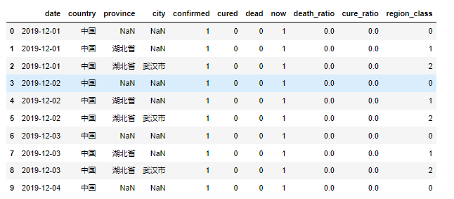1 #数据清洗 2 3 #添加几行关键数据 4 df['now'] = df.confirmed-df.cured-df.dead#现存确诊 5 df['death_ratio'] = df['dead']/df['confirmed']#死亡率 6 df['cure_ratio'] = df['cured']/df['confirmed']#治愈率 7 8 #添加一列,region_class,判断行政级别的数据 9 df['region_class'] = 0 # 国家 10 df.loc[pd.isnull(df.province) == False , 'region_class' ] = 1 # 省 11 df.loc[pd.isnull(df.city) == False , 'region_class' ] = 2 # 市 12 13 #将date格式转化为datetime 14 df['date'].astype('datetime64') 15 16 #将时间作为标签 17 #df = df.set_index('date')#暂时不需要 18 19 df.drop('provinceCode',axis=1,inplace=True)#删除邮政编码列,对本次实验无用数据 20 df.drop('cityCode',axis=1,inplace=True)#删除城市邮政编码列,对本次实验无用数据 21 df.drop('countryCode',axis=1,inplace=True)#删除国家简写列,对本次实验无用数据 22 df.drop('suspected',axis=1,inplace=True)#删除疑似病例列,该数据集没有录入疑似病例 23 24 #删除重复数据 25 df = df.drop_duplicates() 26 27 #空值处理:由于本数据集的空值表示最低地区级别,即城市为空则为省级数据,省级为空则为国家级数据,都是有意义的,所以不处理空值 28 29 #空格处理 30 df['date']=df['date'].map(str.strip) 31 df['country']=df['country'].map(str.strip) 32 #now列和region_class列是新增列,不用进行空格处理 33 34 df.head(10)