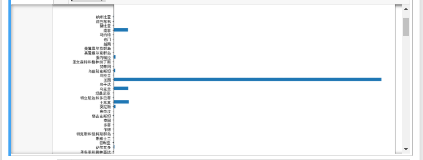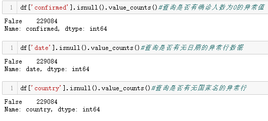 1 #数据清洗查询无用数据 2 df['confirmed'].isnull().value_counts()#查询是否有确诊人数为0的异常值 3 df['date'].isnull().value_counts()#查询是否有无日期的异常行数据 4 df['country'].isnull().value_counts()#查询是否有无国家名的异常行