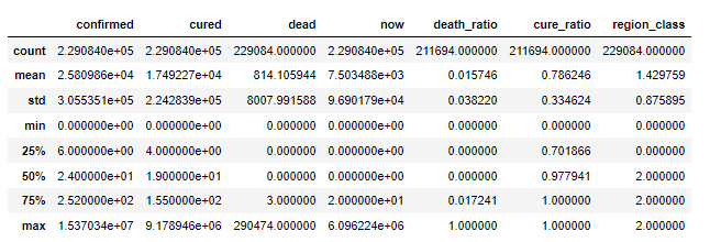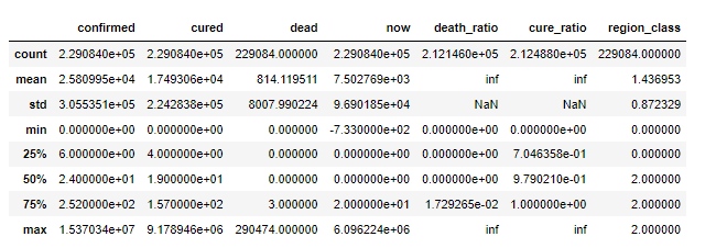 1 #经过对数据的分析和查阅资料后了解到有些病例治愈了未公布来源 2 #还有个别地区出现数据错误,外国苏里南也出现了数据错误,对此将对这些负数值赋为0 3 df.loc[df[df['now']<=0].index,['now']]=0 4 5 df['death_ratio'] = df['dead']/df['confirmed']#死亡率 6 df['cure_ratio'] = df['cured']/df['confirmed']#治愈率