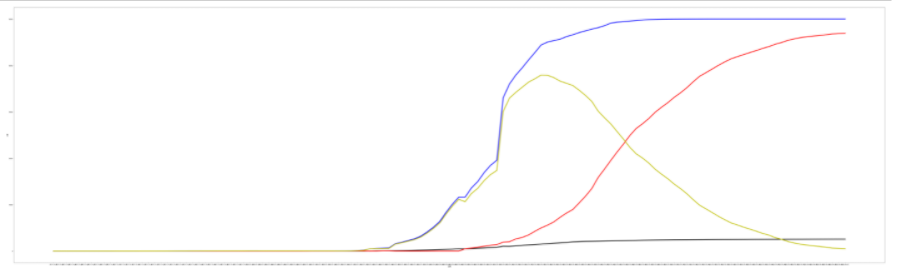 1 #将4个图融汇在一个图中 2 plt.figure(figsize=(100,30)) 3 plt.xlabel("日期") 4 plt.ylabel("人数") 5 plt.plot(wuhan_date,wuhan_dead,linewidth=5.0,c='k',label="死亡病例") 6 plt.plot(wuhan_date,wuhan_cured,linewidth=5.0,c='r',label="治愈病例") 7 plt.plot(wuhan_date,wuhan_confirmed,linewidth=5.0,c='b',label="所有病例") 8 plt.plot(wuhan_date,wuhan_now,linewidth=5.0,c='y',label="现存病例") 9 plt.show()
