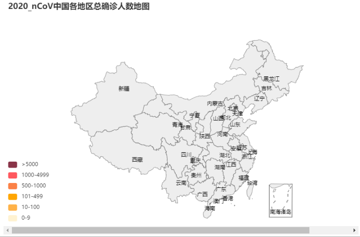 1 from pyecharts.charts import Map 2 import pyecharts.options as opts 3 from pyecharts.globals import ChartType 4 5 #制作一张中国地图疫情图 6 7 ( 8 Map() 9 .add("",[list(z) for z in zip(list(province_data["tihuan"]), list(province_data["confirmed"]))], "china",is_map_symbol_show=False) 10 .set_global_opts(title_opts=opts.TitleOpts(title="2020_nCoV中国各地区总确诊人数地图"),visualmap_opts=opts.VisualMapOpts(is_piecewise=True, 11 pieces = [ 12 13 {"min": 5000 , "label": '>5000',"color": "#893448"}, #不指定 max,表示 max 为无限大 14 {"min": 1000, "max": 4999, "label": '1000-4999',"color" : "#ff585e" }, 15 {"min": 500, "max": 999, "label": '500-1000',"color": "#fb8146"}, 16 {"min": 101, "max": 499, "label": '101-499',"color": "#ffA500"}, 17 {"min": 10, "max": 100, "label": '10-100',"color": "#ffb248"}, 18 {"min": 0, "max": 9, "label": '0-9',"color" : "#fff2d1" }])) 19 20 ).render_notebook()