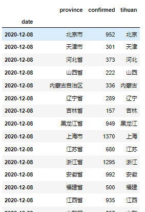 通过pyecharts来制作中国疫情地图,首先提取改数据集最新的数据:2020-12-8