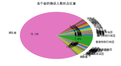 1 #各个省的确诊人数所占比重 2 fig = plt.figure() 3 plt.pie(province_confirmed,labels=province,autopct='%1.2f%%') #画饼图(数据,数据对应的标签,百分数保留两位小数点) 4 plt.title("各个省的确诊人数所占比重") 5 6 plt.show()