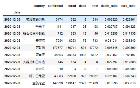 1 df_index_date = df.set_index('date')#将时间作为标签 2 3 date20201208 = df_index_date['2020-12-08':'2020-12-08']#取出该数据集最后一日的数据(2020年12月8日) 4 5 world_data = date20201208[date20201208['region_class'] == 0]#提取以国家为单位的数据 6 7 world_data.drop('province',axis=1,inplace=True)#删除省份列 8 world_data.drop('city',axis=1,inplace=True)#删除城市列 9 world_data.drop('region_class',axis=1,inplace=True)#删除地域级别列 10 11 world_data.head(10)