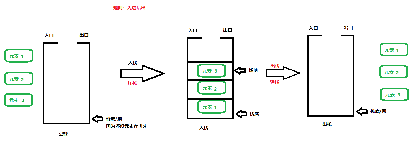 1、先进后出:先存的元素,后面才能取出(类似于子弹压枪 先压进的子弹 后射出)