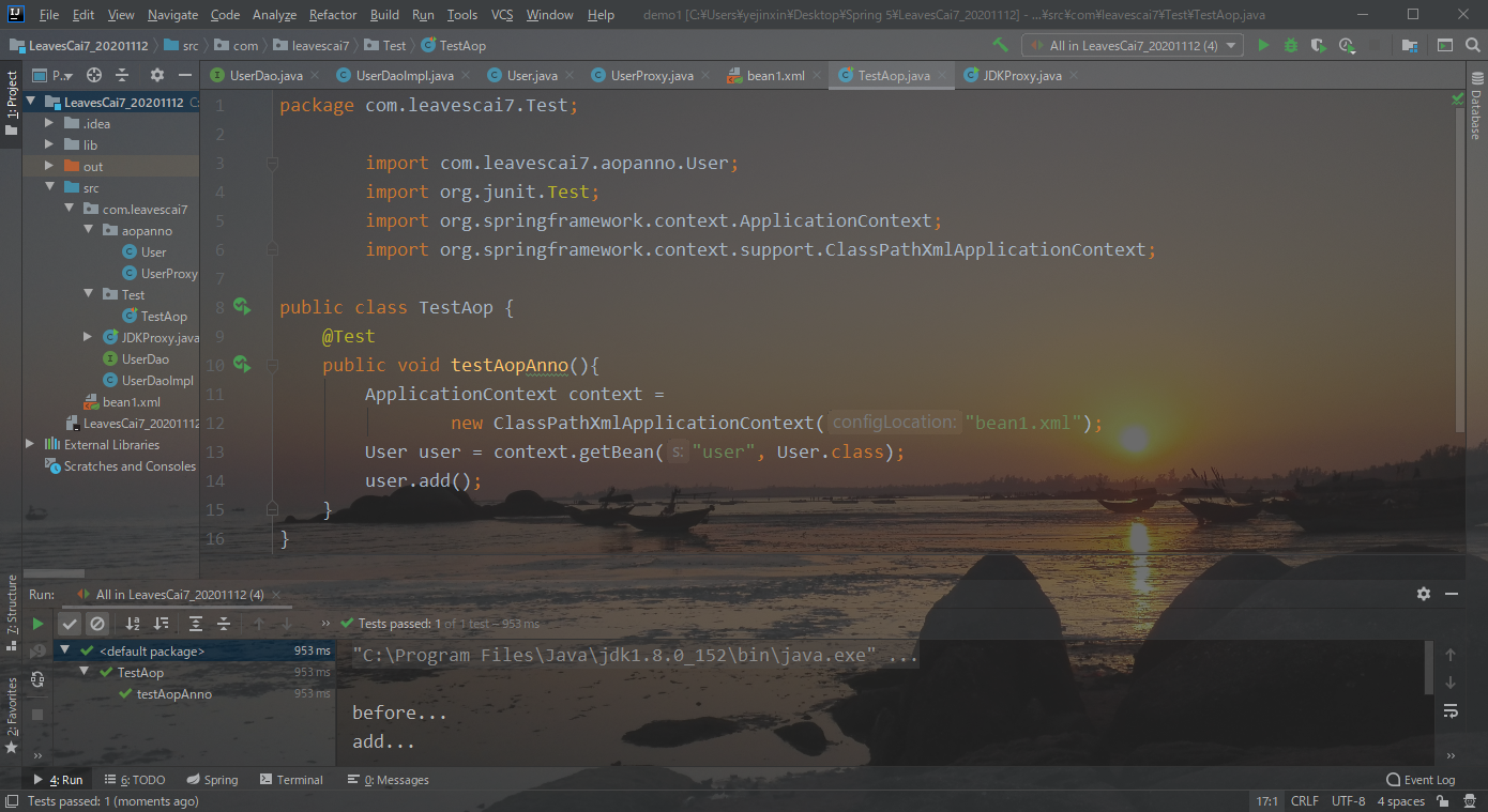 1 package com.leavescai7.aopanno; 2 3 import org.aspectj.lang.annotation.Aspect; 4 import org.aspectj.lang.annotation.Before; 5 import org.springframework.stereotype.Component; 6 7 //增强的类 8 @Component 9 @Aspect //生成代理类 10 public class UserProxy { 11 @Before(value = "execution(* com.leavescai7.aopanno.User.add(..))") //把以下方法(功能)插入到原来的方法之前执行,这就是不该变源代码,通过代理类增加功能 12 public void before(){ 13 System.out.println("before..."); 14 } 15 }