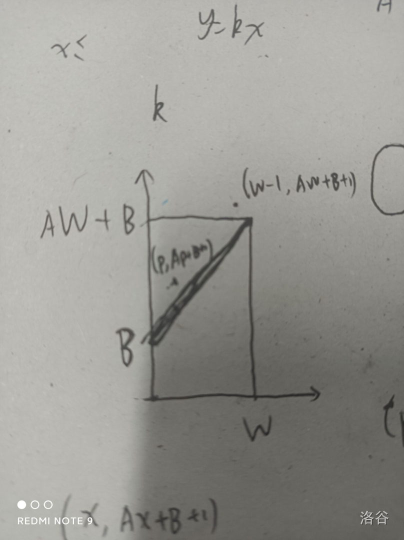 再考虑任意从\((0,0)\)出发,走到\((W-1,AW+B+1)\)的路径,枚举他第一穿过直线的横坐标\(p\),有