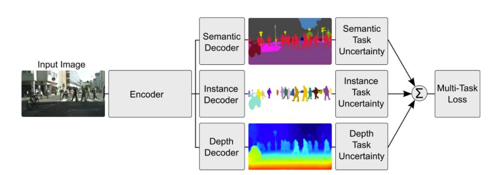 图 7:用于多任务学习的基于不确定性的损失函数加权(Kendall 等人,2017)。