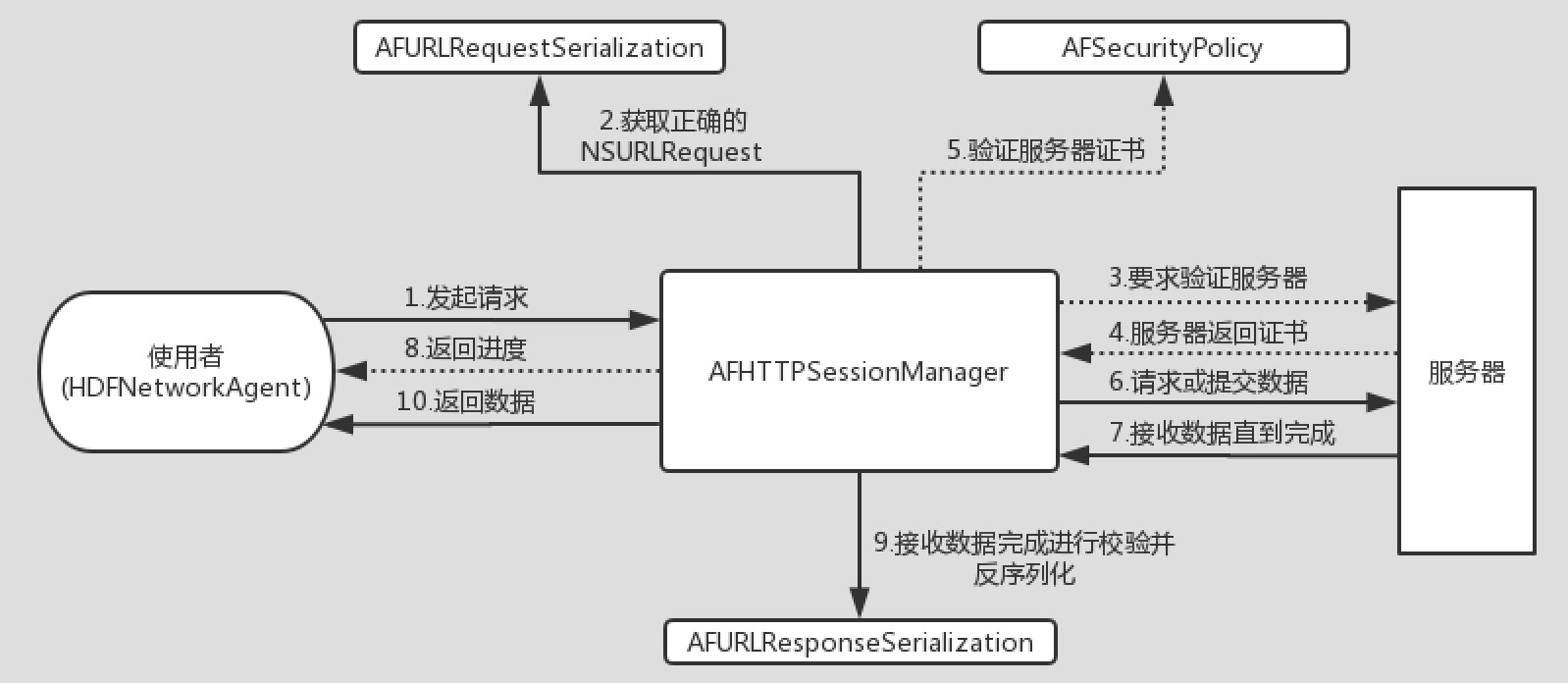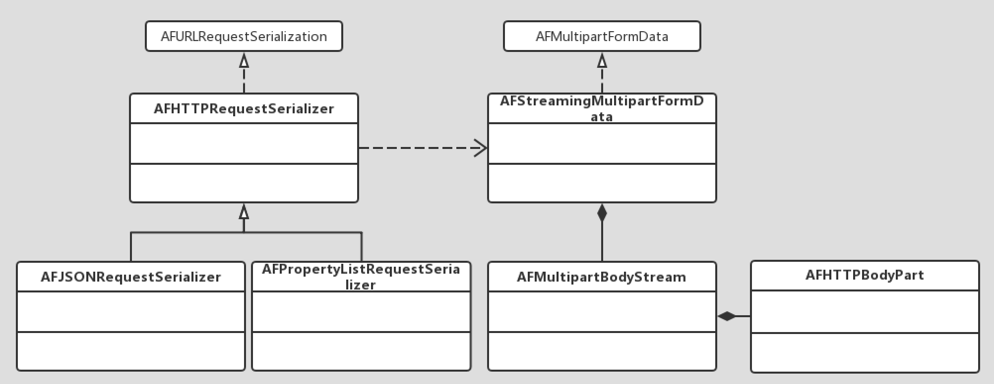 - AFMultipartBodyStream:它起着一个重要桥梁作用,上传表单数据时系统会先调到它,然后它会依赖AFHTTPBodyPart读到数据,然后把数据返回给URL系统。