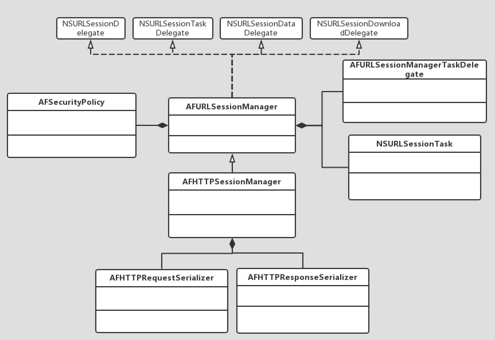 - AFURLSessionManager实现了六个协议,其中包含:NSURLSessionDelegate, NSURLSessionTaskDelegate, NSURLSessionDataDelegate, NSURLSessionDownloadDelegate。