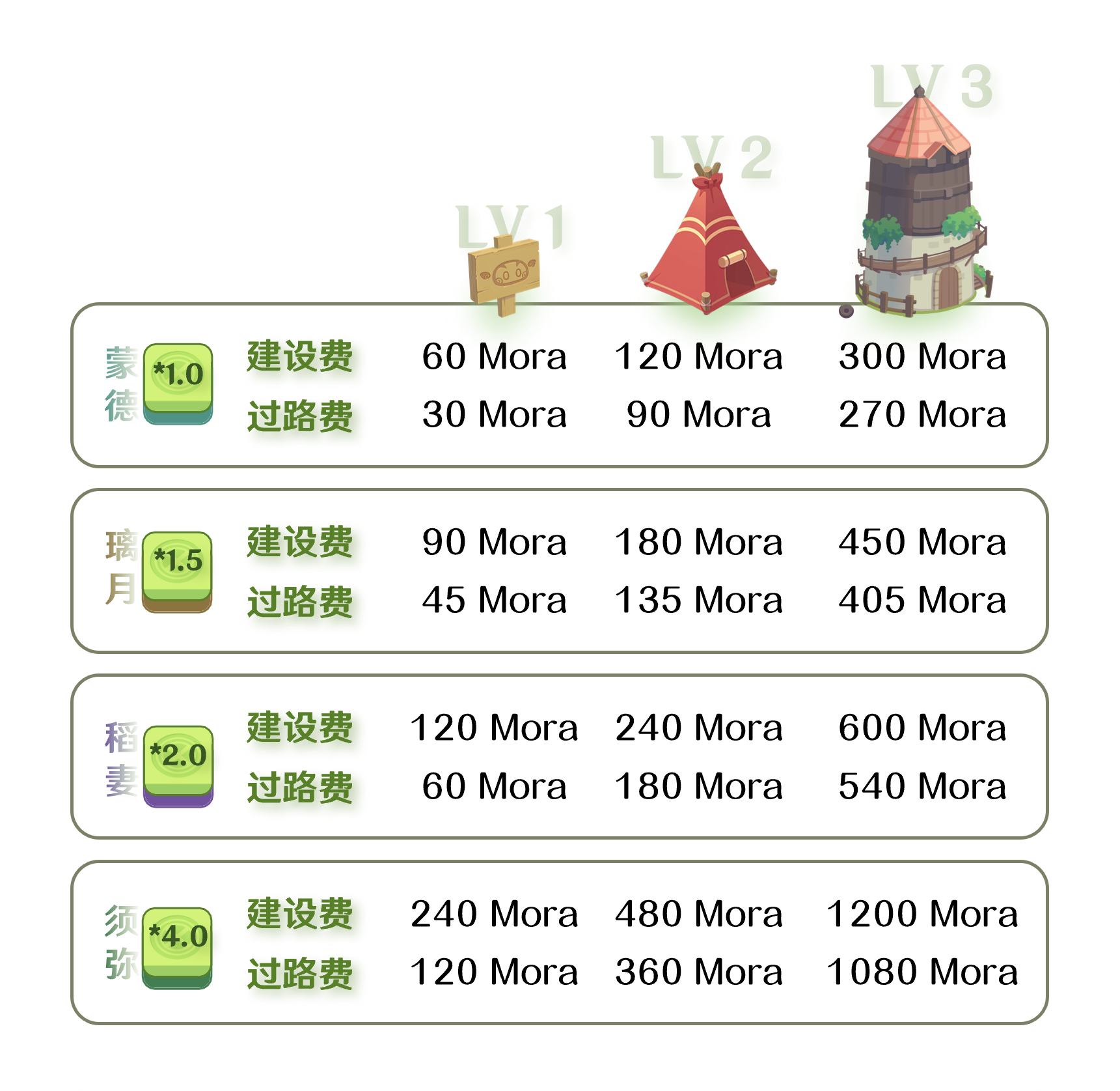 蒙德地皮为基础倍率 *1.0 ,其上 Lv 1 / Lv 2 / Lv 3 房产的建设费分别为 60 / 120 / 300 Mora,过路费分别为 30 / 90 / 270 Mora。璃月 / 稻妻 / 蒙德地皮的建设费与过路费分别按照 *1.5 / *2.0 / *4.0 倍率计算。