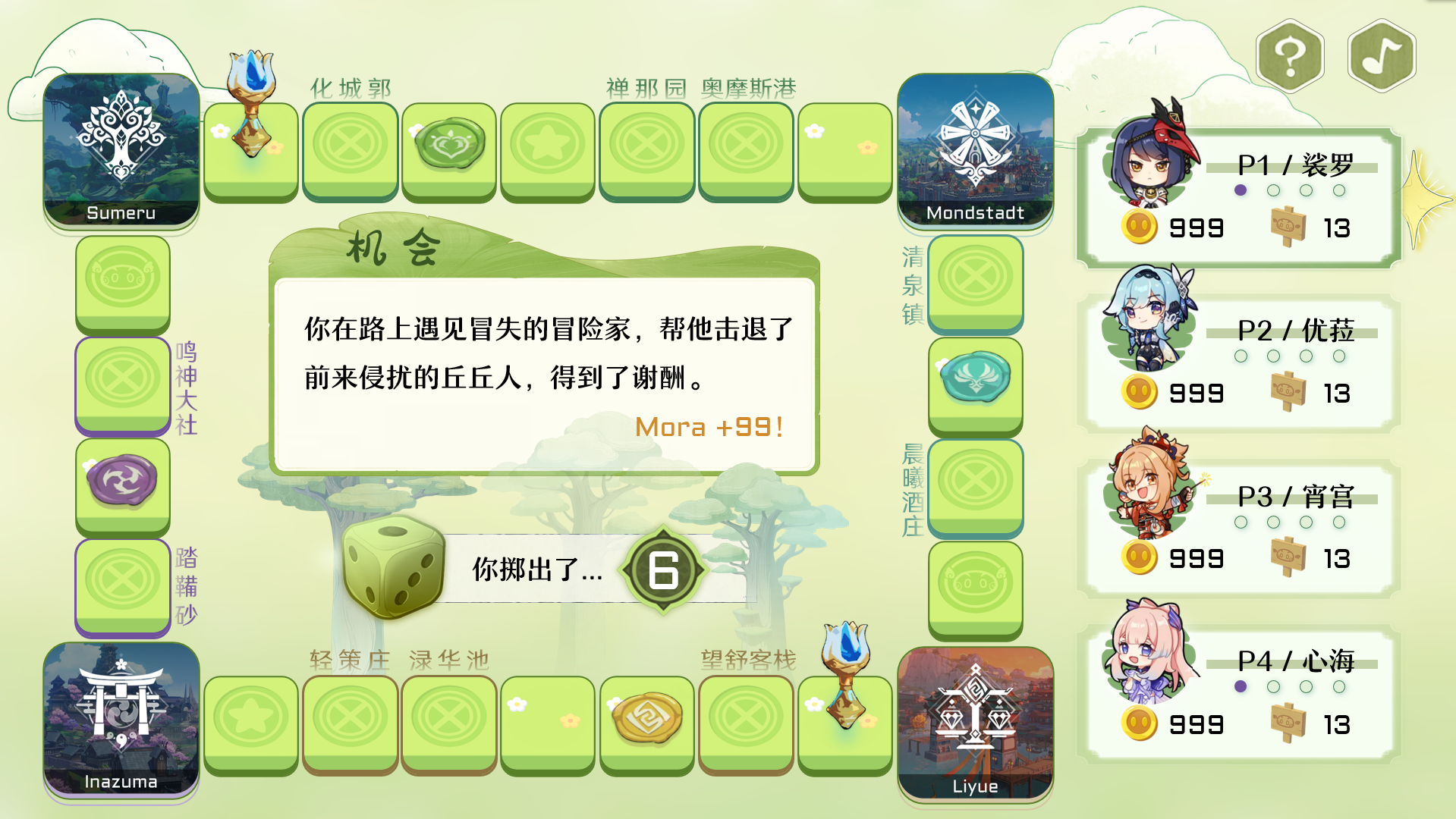 大富翁系列桌游玩法易于理解,充满趣味性,轻松愉快,老少皆宜,久盛不衰。我们受大富翁游戏启发,尝试将线下的乐趣用 Python 中 Pygame 复现,并融入『原神』游戏的美术、故事与角色,开发了这款『西风哗哗?大赢家!』游戏。