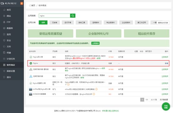 首先在宝塔面板的软件商店里面安装Nginx: