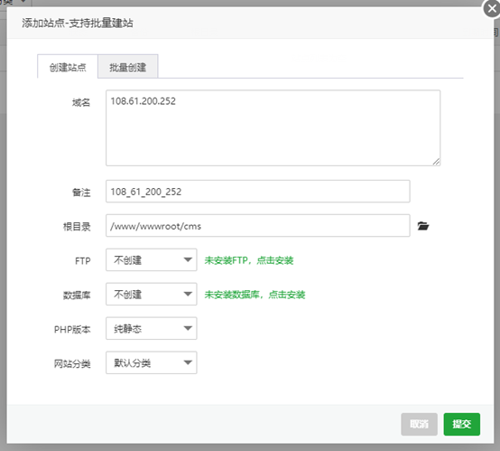 输入网站的域名,如果没有域名,可以输入服务器的IP地址用于临时访问。然后修改网站的根目录为/www/wwwroot/cms,FTP:不创建,数据库:不创建,PHP版本:纯静态,然后点击提交: