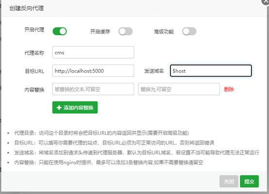 输入代理名称:cms,目标URL:http://localhost:5000,发送域名:$host,然后点击提交: